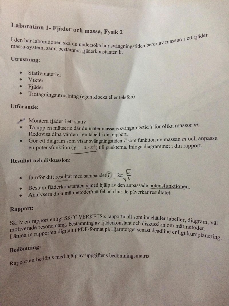 MJLancer skrev:MJLancer skrev:Oj nu skäms jag lite för vi var två personer, jag startade och stoppade tiden medans den andra håll koll på när de 10 svängningarna var klara. Vi startade tiden direkt när vi släppte taget om vikten. Jag fattar inte riktigt hur det gör någon skillnad om man gör direkt och låter den svänga en gång?Glömde nämna också att jag ska ta reda på en potensfunktion dvs y=a*x^b a=1.078756815 och b=0.3215463327 med en miniräknare och med hjälp av den ska jag ta reda på Fjäderkonstanten.