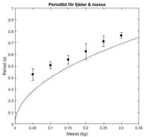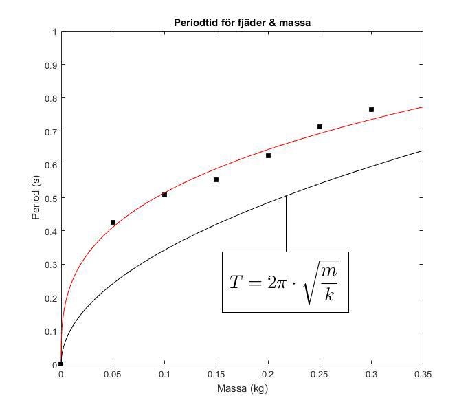 De svarta fyrkanterna är mätningarna med respektive felgräns och den röda kurvan är den verkliga modellen plottad med fjäderkonstanten du tog fram. Som du kan se så har det antingen blivit ett grovt fel vid någon av mätserierna eller så har det förekommit ett systematiskt fel i alla serier.