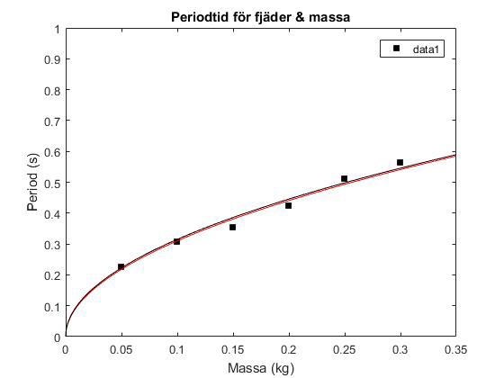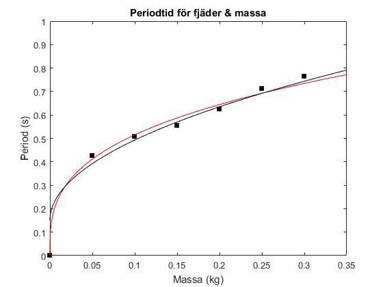 Nu ser vi att den svarta kurvan (vår verkliga modell justerad) anpassar sig bra till era mätpunkter. Så, vad betyder detta? Detta bör betyda att om vi subtraherar 0.2 sekunder från alla mätningar för perioden borde vi få den korrekta fjäderkonstanten. Om vi gör det får vi att a = 0.9964 och b = 0.507.