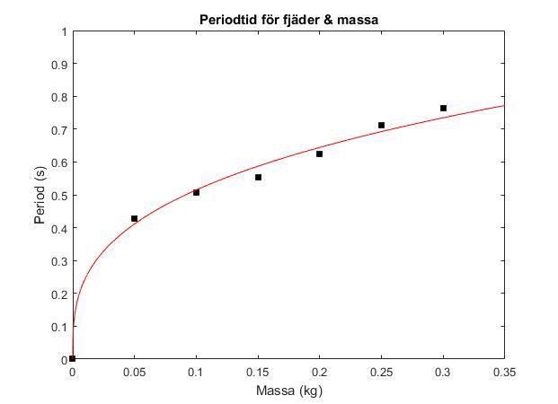 k = (4 ∏² m) / T²Du bör ta dina mätvärden på perioden, kvadrera dessa och sedan plotta mot massan. Då har du linjäriserat relationen mellan periodtid och massa. Detta därför att vi får: