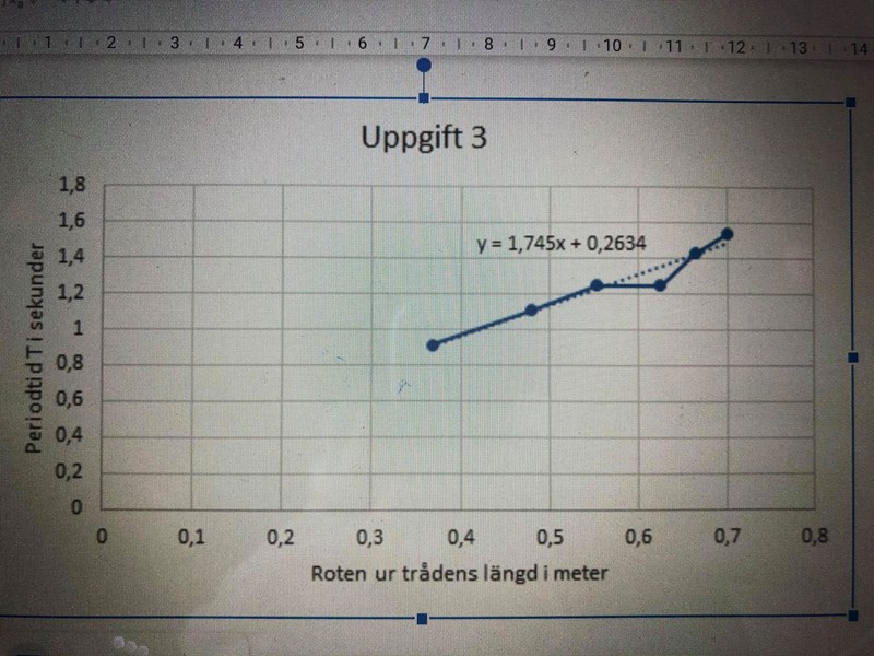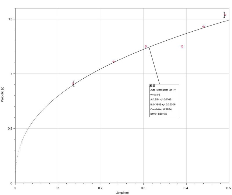 Vinkeln från vilken du släpper vikten är ca 15°. Plotta på millimeterpapper perioden, T, som funktion av roten ur trådens längd, √𝑙. Bestäm sedan, genom grafens lutning, ett värde på tyngdaccelerationen, g"