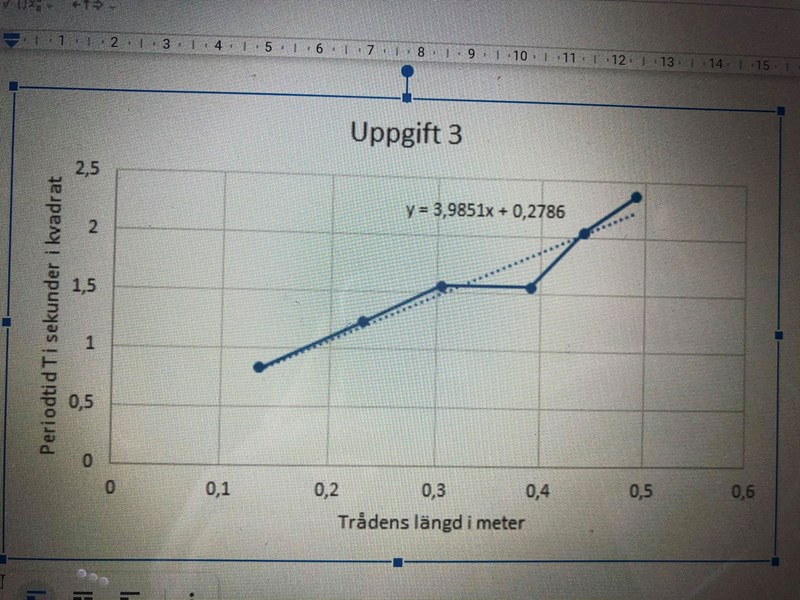 Så här vill läraren att vi gör, se nedan. Jag får dock inte rätt på det. y=kx+m, och då får jag y=1,745x+0,2634, vilket ger orimligt värde på g.