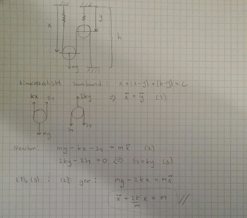 x är definierad efter första bilden som används för att ta fram det kinematiska sambandet, alltså trissans position i förhållande till "taket". Felet jag gjorde var att anta att förskjutningen av fjädern är lika med förskjutningen av trissan i ekvation (2). Jag lyckades lösa uppgiften nu. Tack för hjälpen!