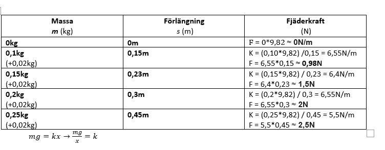 d) Häng några olika vikter i fjädern och för in dina värden och beräkningar i