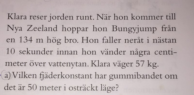 De 50m som står i uppgiften är längden på linan i osträckt läge. Dvs, när Klara står på bron så har hon 50m med slak lina. När hon fallit 50m så börjar linan att sträcka ut sig.