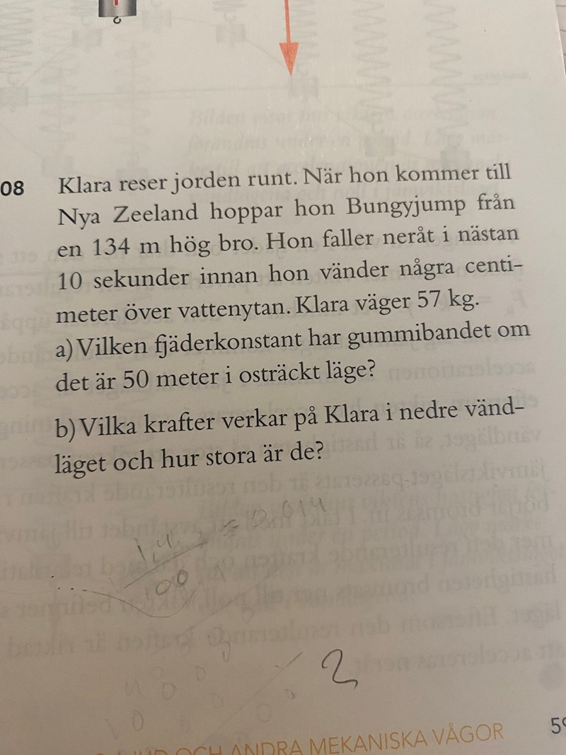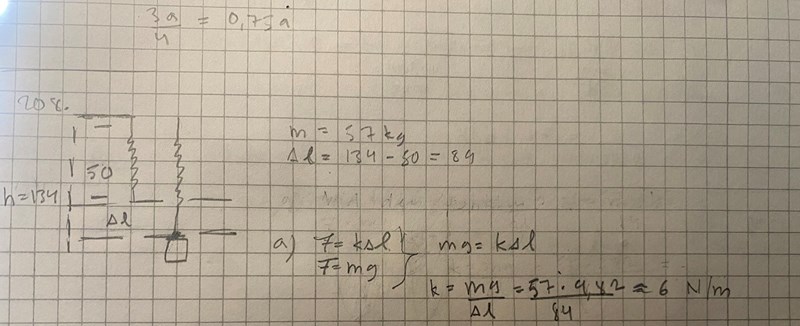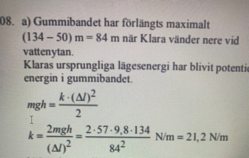 I uppgiften nedan ska man lösa fjäderkonstanten. I facit har de använt sig av lägesenergi men jag förstår inte varför det inte går att använda mg=k•delta l och sen lösa ut k. Jag bifogar min lösning såväl som facit och uppgiften