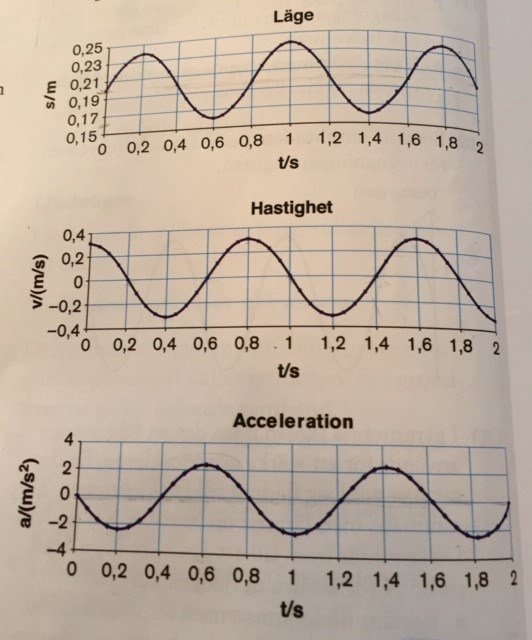 Figurerna visar läge, hastighet och acceleration som funktion av tiden för en pendel. Positiv riktning är uppåt i figuren. Pendeln väger 0.45 kg.