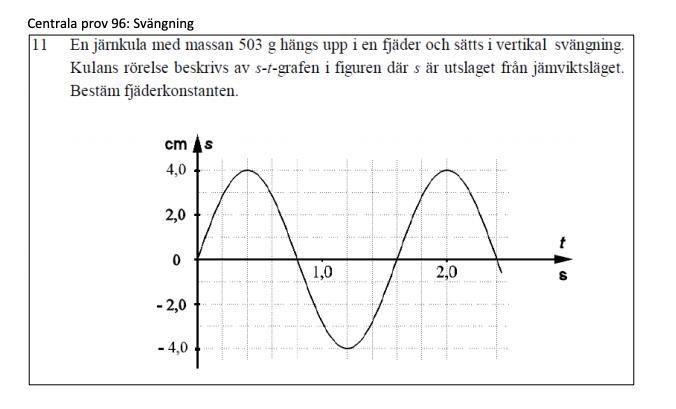 Hej! Förstår verkligen inte hur jag skall lösa denna. Jag har försökt med många olika formler men får aldrig rätt svar. Skulle någon kunna hjälpa mig? Vilken formel bör jag använda? F=kx går ju inte då man behöver ta hänsyn till tiden också.