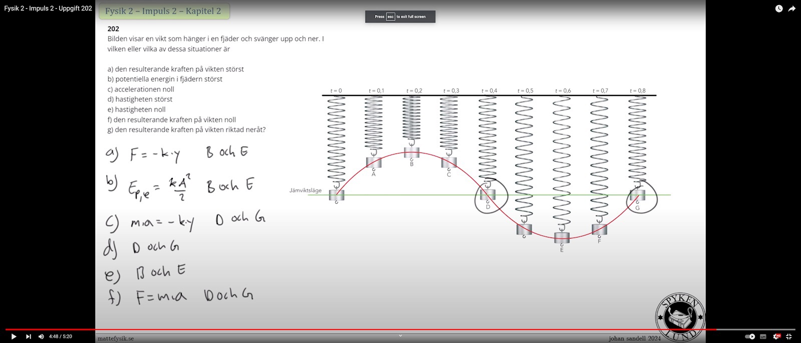 När vikten rör sig från B till D så ökar hastigheten (accelerationen är medriktad rörelsen: neråt) men accelerationen minskar. I D blir accelerationen 0 (y=0 och det finns en massa). Från D till E minskar hastigheten (accelerationen är motriktad rörelsen: uppåt) men accelerationen ökar (y ökar ju).