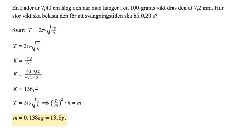 Jag har en upp som lyder: En fjäder är 7,40 cm lång och när man hänger i en 100-grams vikt dras den ut 7,2 mm.