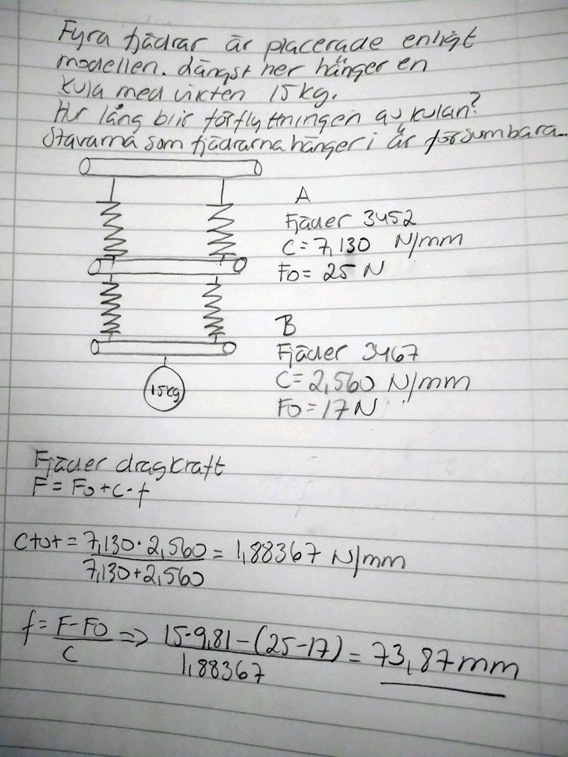 Jag skulle räkna ut en ersättningsfjäder A med ett CA och ett F0A. Sedan samma sak för B.