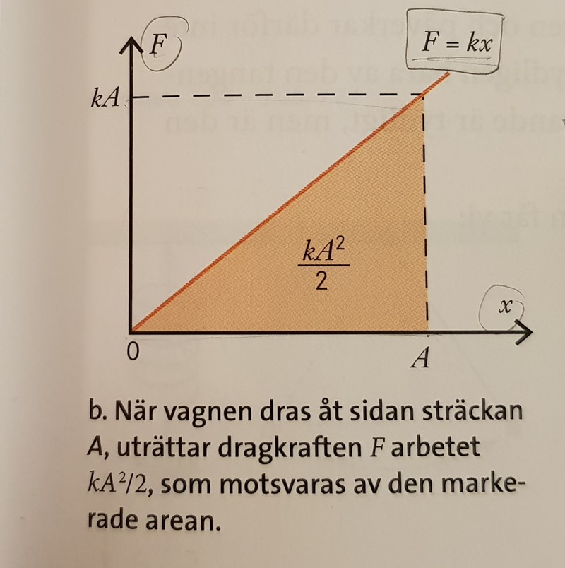 Min fråga gäller lagen om arbete (W). Jag förstår hur arean under grafen för fallet ovan gör att arbetet beräknas med formeln kx2/2 (Där kraften F=Kx) och så står det också i min lärobok för fysik 2, men jag förstår inte vad det speciella är i denna sorts rörelse så att den vanliga formeln för arbete W=Fx är fel och inte gäller här.