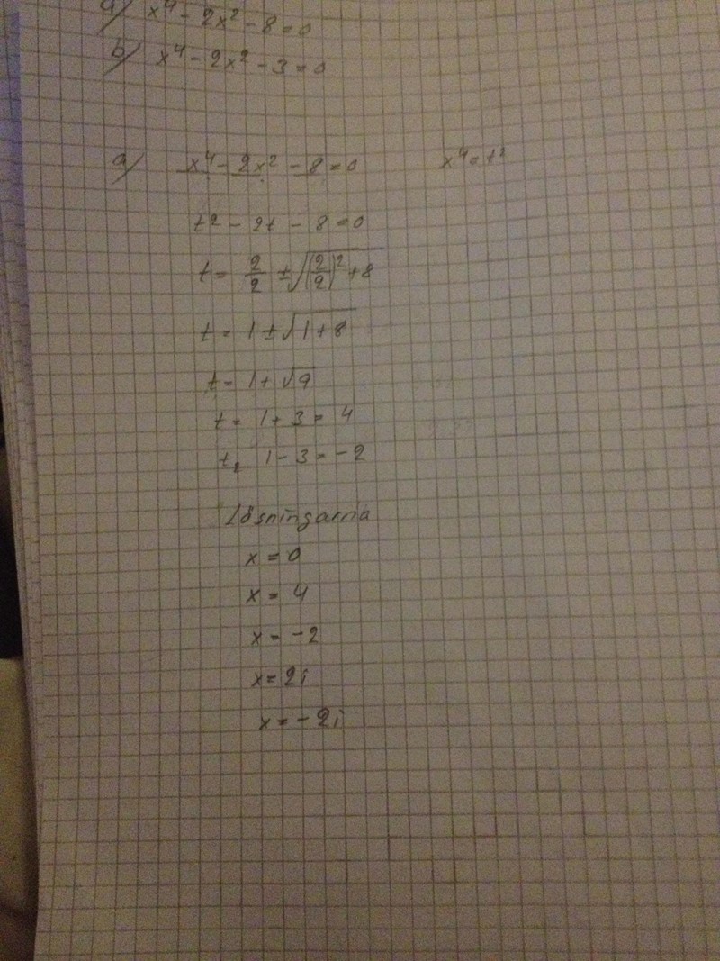 (2i)4-2·(2i)2-8=24i4-2·(22i2)-8=16·(-1)2-2·4·(-1)-8=16+8-8=16. Det stämmer inte.