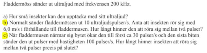 På b) Hur räknar jag fram tiden? Kan jag tolka 10 ultraljudspulser/s som frekvens? Och genom det räkna fram perioden?