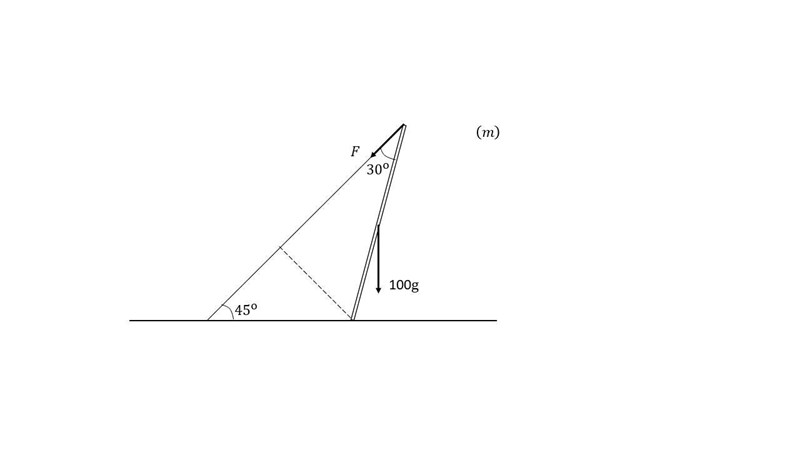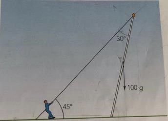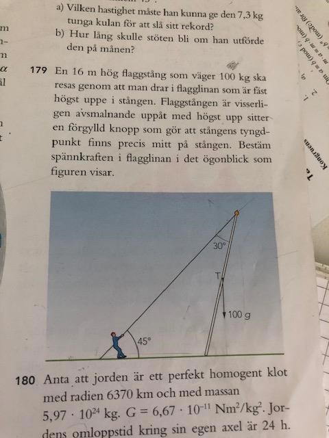En 16 m hög flaggstång som väger 100 kg ska resas genom att man drar i flagglinan som är fäst högst uppe på stången. Bestäm spännkraften i flagglinan:
