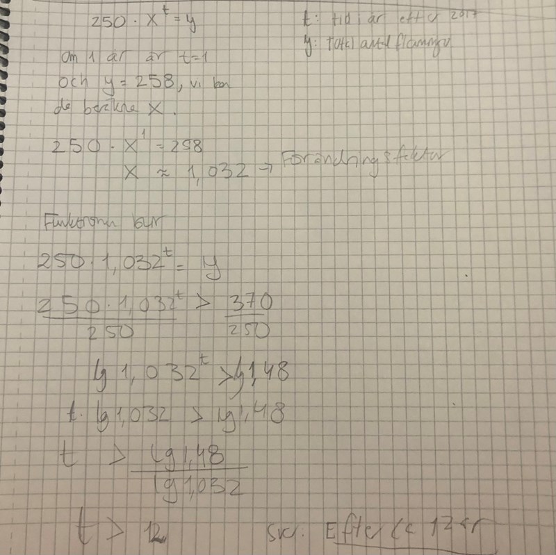 Ställ upp en modell, och beräkna det år då antalet flamingos överstiger 370.