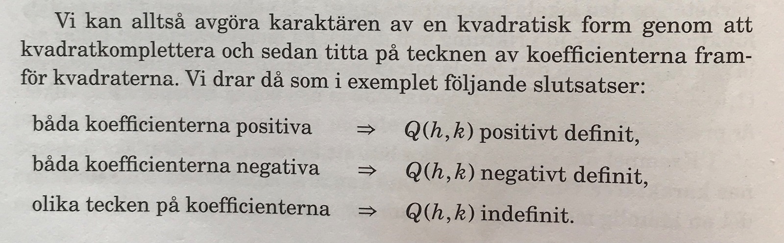 Kvadratkomplettering gör man för att få formen omskriven så att den bara består av kvadrater, då kan man bestämma karaktären enkelt genom att jämföra koefficienternas tecken.