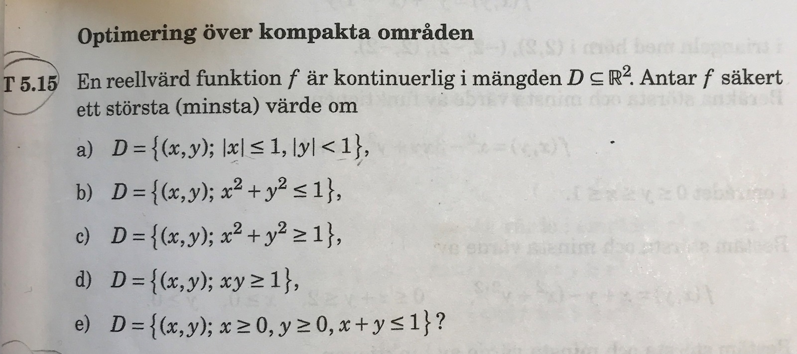 En annan viktig sats som är verksam i den här uppgiften är: "Om en funktion är kontinuerlig på en kompakt mängd så antar den sitt max och sitt min på mängden." Notera att den bara gäller i EN riktning. Det är således INTE sant att om en kontinuerlig funktion antar sitt max och min på en mängd så är mängden kompakt. Ex: Låt f(x)=1 för alla x i R. Den antar sitt max och sitt min (=1) men R är inte begränsad och alltså inte kompakt.
