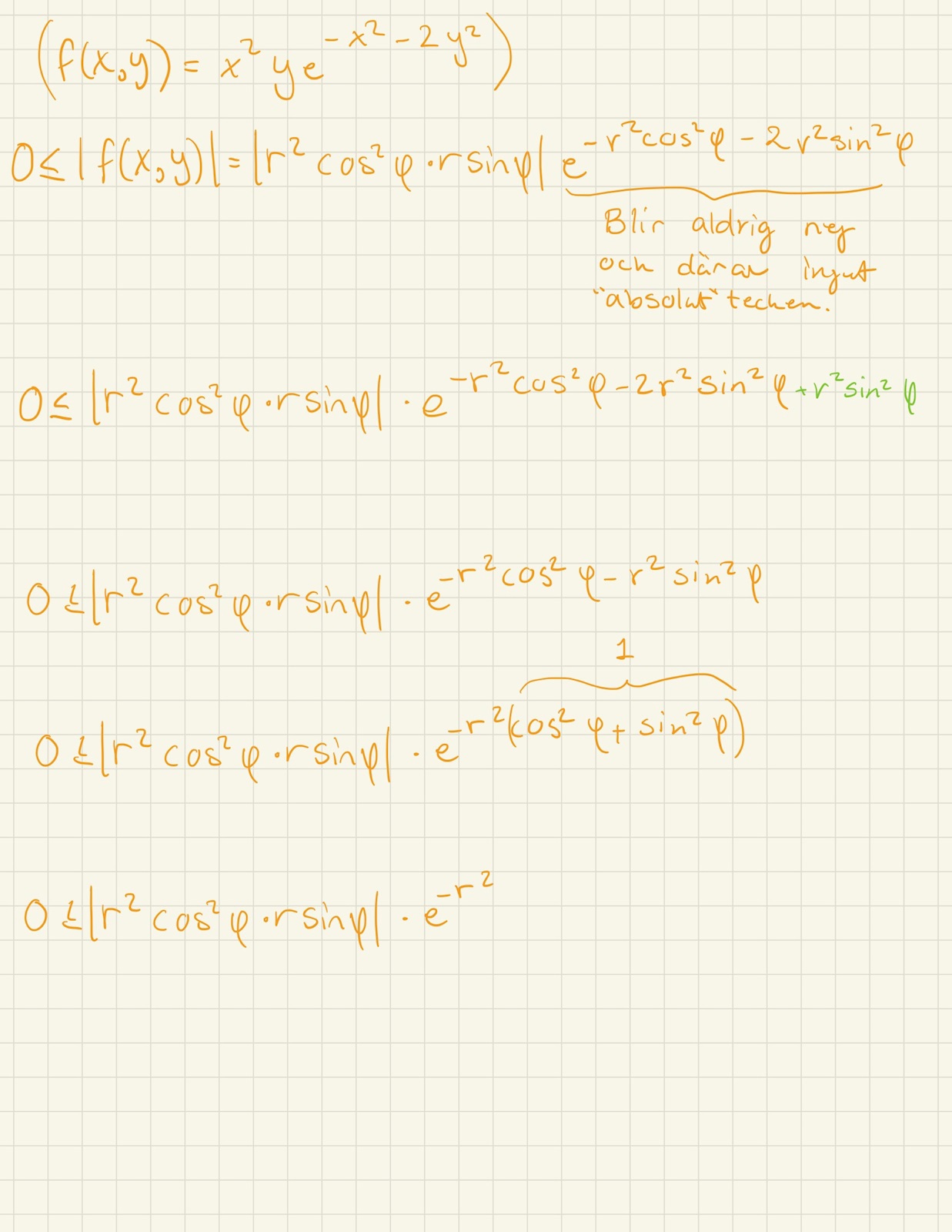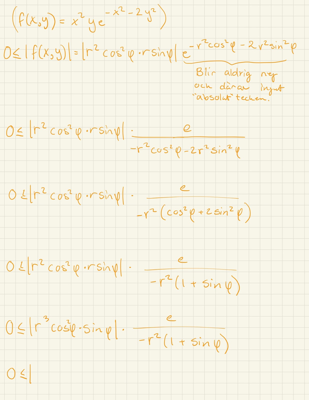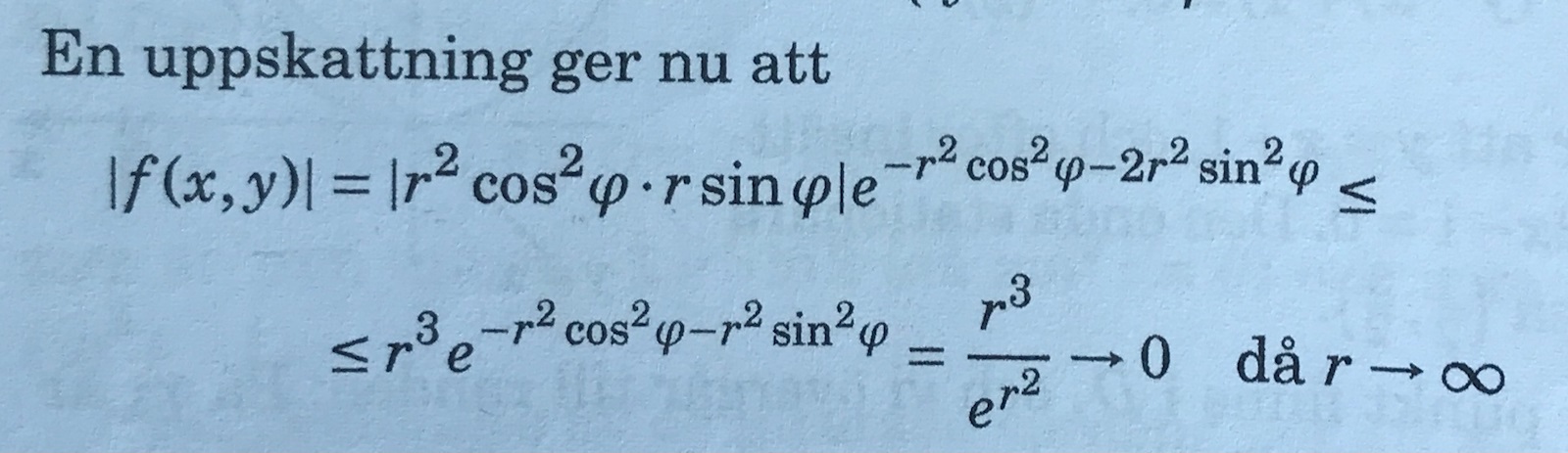 Vid första olikhetstecknet adderar de r^2sin^2(phi) till exponenten, vilket gör hela uttrycket större. Detta för att kunna använda den trigonometriska ettan cos^2(phi) + sin^2(phi) = 1.