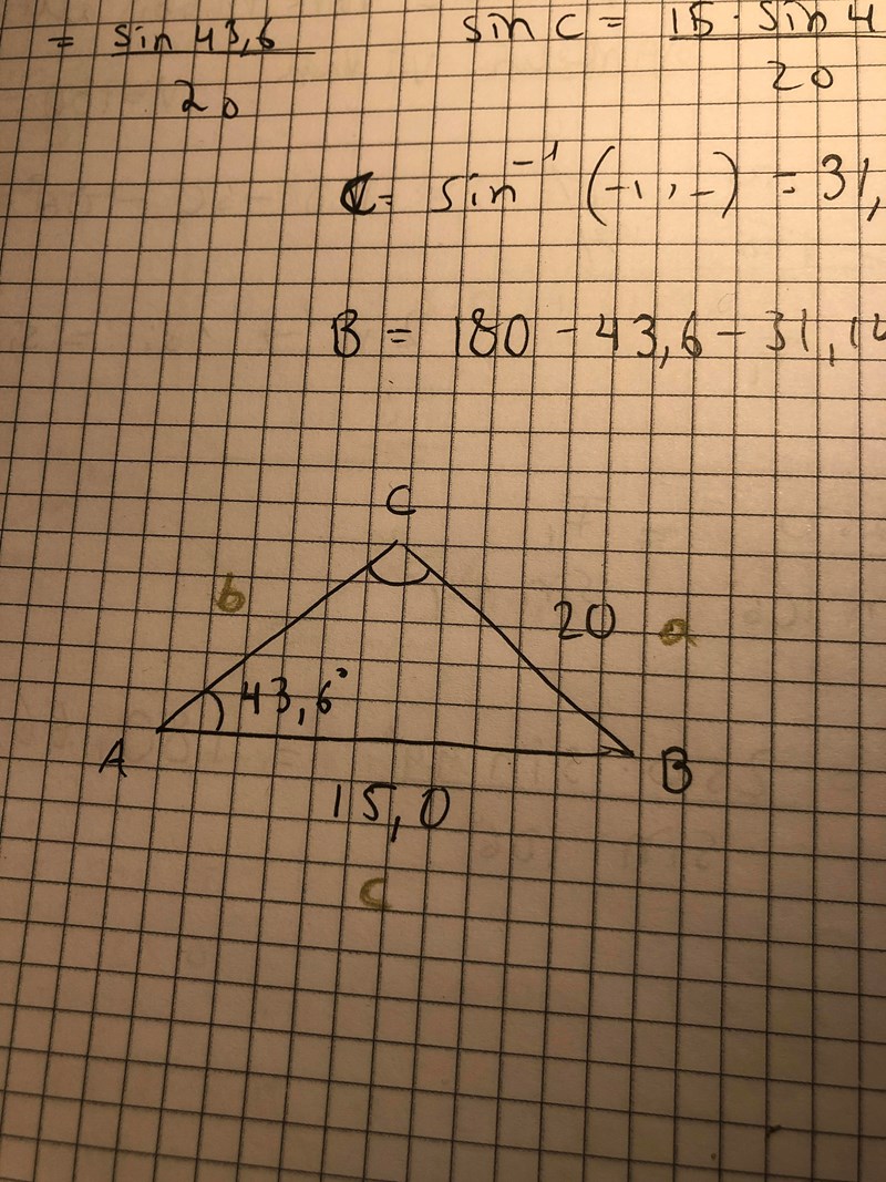 - Sedan kan du räkna ut vinkeln C för du vet att vinkelsumman är 180 grader.