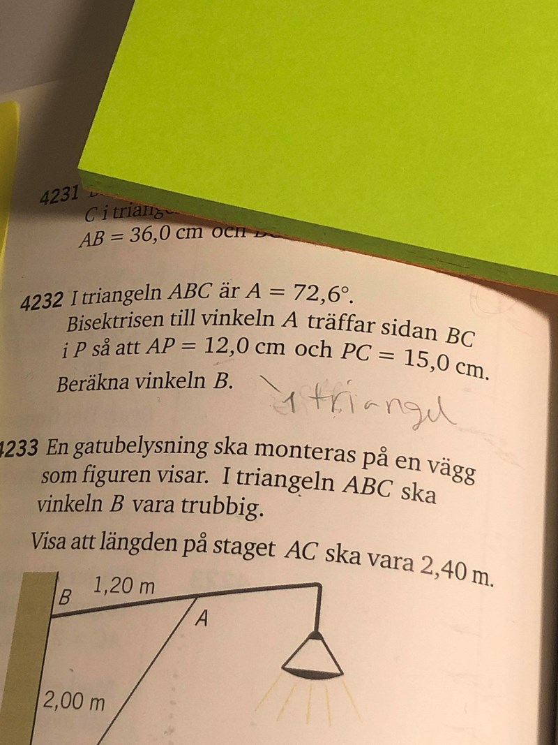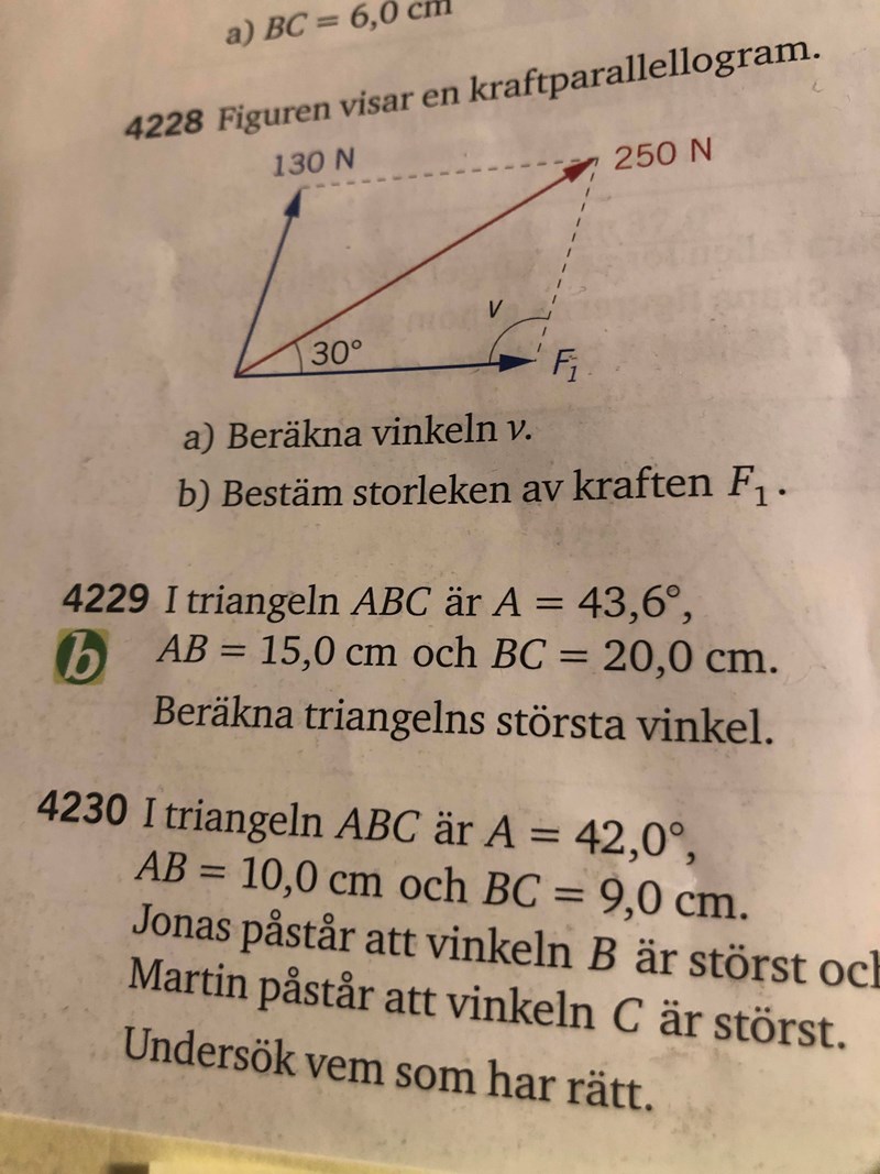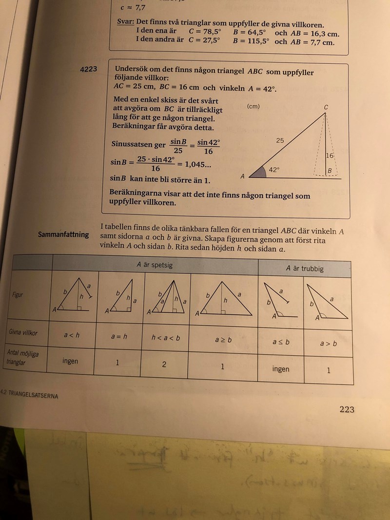 Uppgiften 4229 så säger de att det är en triangel men om vi istället låtsas att det inte står för en triangel, hur kan man avgöra om det blir en eller flera (sinussatsen ger 2 fall)?