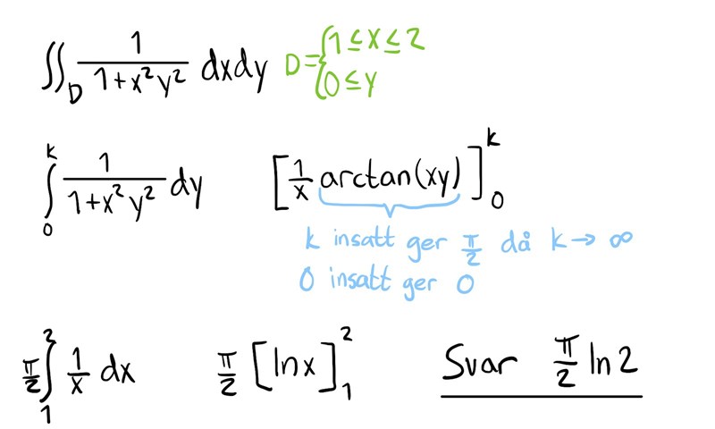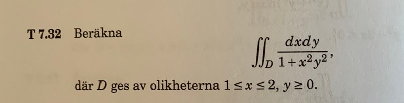 jag har löst denna uppgiften men behöver hjälp att förstå det jag har skrivit i blå text. Varför kan jag bortse från x i arctan(xy), är det för att x i detta fall går från 1 till 2? Eller är det för att det är en konstant eftersom det är med avseende på y som vi har integrerat? Hade man kunnat säga att arctan(xy) blir pi/2 om till exempel x<0 och går mot negativa oändligheten?