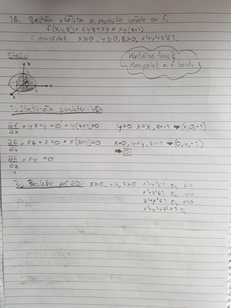 Tricket här är att inse att randen till ett tredimensionellt område är en yta. Du kommer alltså att behöva leta efter största och minsta värde på ett tvådimensionellt område för att undersöka randen.
