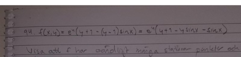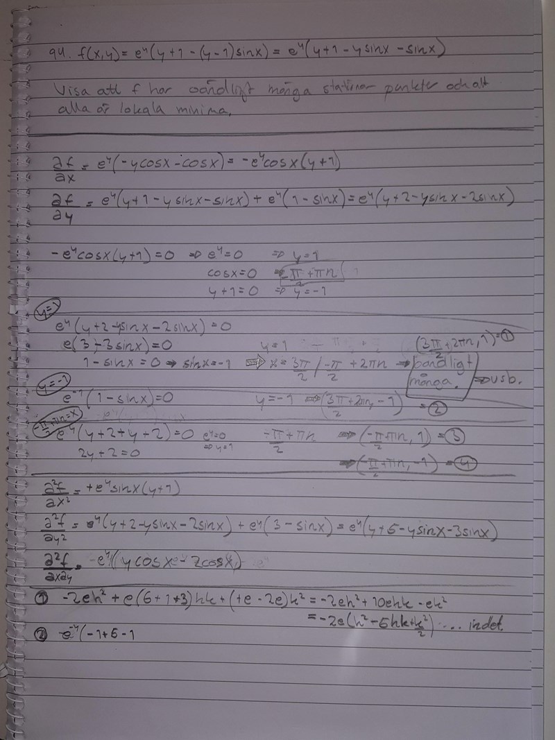 Jag får ursäkta den kladdiga lösningen. Men mitt problem är att enligt uppgiften så ska ALLA punkter vara lokala minima. Jag får fram flera olika typer punkter (1,2,3 och 4). Därmed tänkte jag att de som inte är minima måste vara indefinita. Men i facit står de att de stationära punkterna som finns är av typ 2 (dvs finns inga stationära som ej är extrempunkter) Menar de som jag har tänkt eller har jag gjort fel? Dvs typ 1, 3 och 4 finns inte.