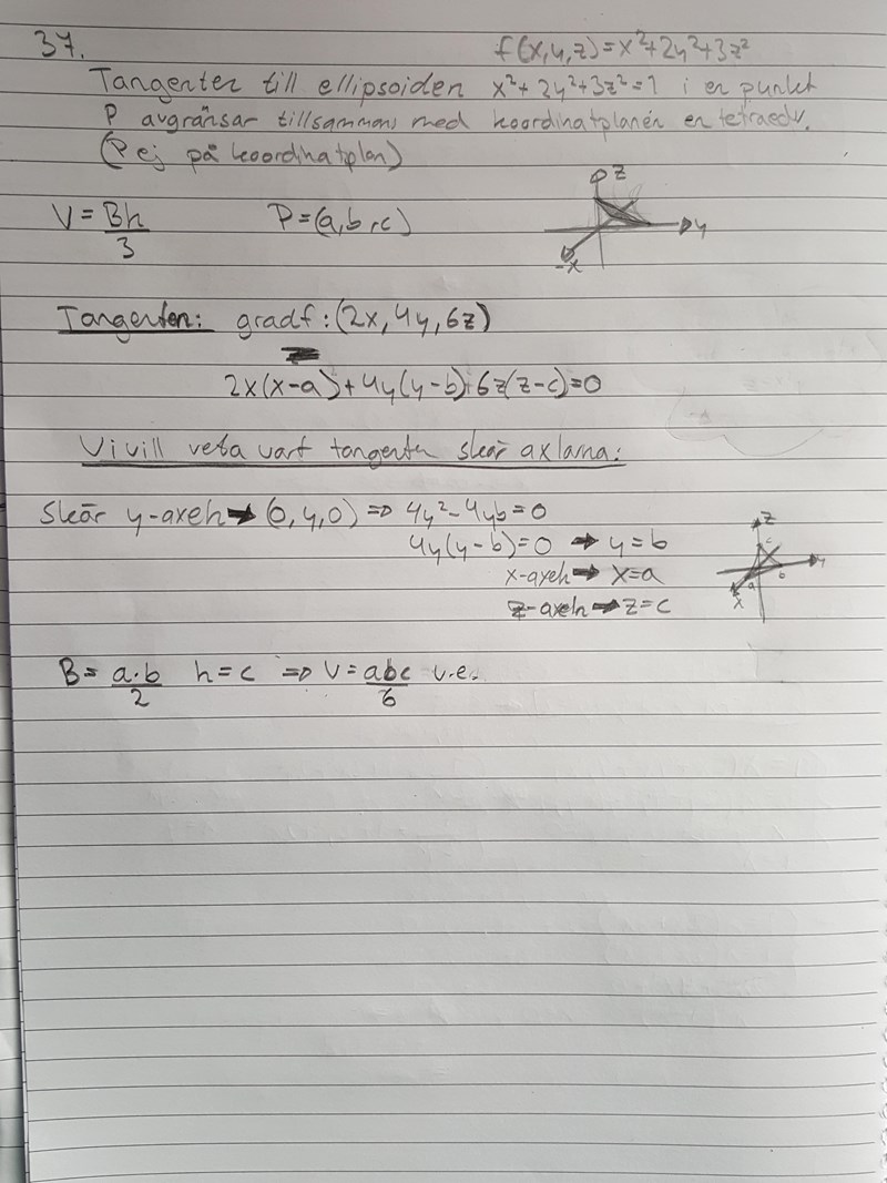 Att räkna ut skärningspunkterna med axlarna är en god idé. När du sedan har ett uttryck för volymen givet en punkt (a,b,c) på ellipsoiden kan du minimera volymen givet bivillkoret. Ska vi vara petiga är det bra att tänka på att en volym, liksom en sträcka, alltid är större än noll (använd t.ex. absolutbelopp).