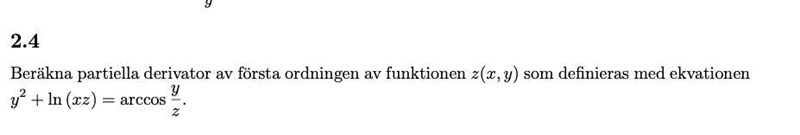 1. Jag ser inte hur jag ska beräkna partiella derivator på detta uttryck då vi har z både i en ln-parantes samt i en arccos-parantes. Hur får jag ut z?