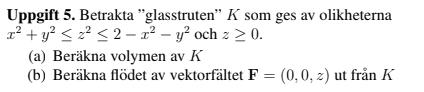 Jag har beräknat volymen i a) uppgiften till , Jag har dubbelkollat med sfäriska och cylindriska och får samma så det borde stämma. Men i b) frågan, det känns som att man kan utnyttja det faktum att man vet volymen när man ska beräkna flödet och det har något med Gauss divergenssats att göra. Men jag vet inte riktigt hur jag ska gå vidare från det. Någon som kan förklara?