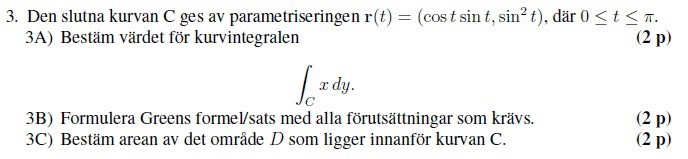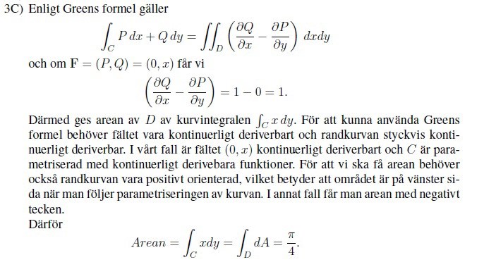 Detta är en gammal tentauppgift, så plottning är inte tillåtet. Jag har en undring angående 3C). Hur vet man hur området D ser ut givet parametriseringen av kurvan? Det finns några villkor som måste uppfyllas för att kunna använda Greens sats, vilket besvaras i 3B). En av dessa är, vad jag förstått, att området D som man applicerar greens sats på är reguljär och att kurvan C omger området D, dvs C är sluten. Men om det inte är klart hur området ser ut, hur ska jag kunna veta om området D är reguljär och om den är sluten? För övrigt verkar vektorfältet vara kontinuerligt deriverbar och kurvan likaså, då den är parametriserad med kontinuerligt deriverbara funktioner.