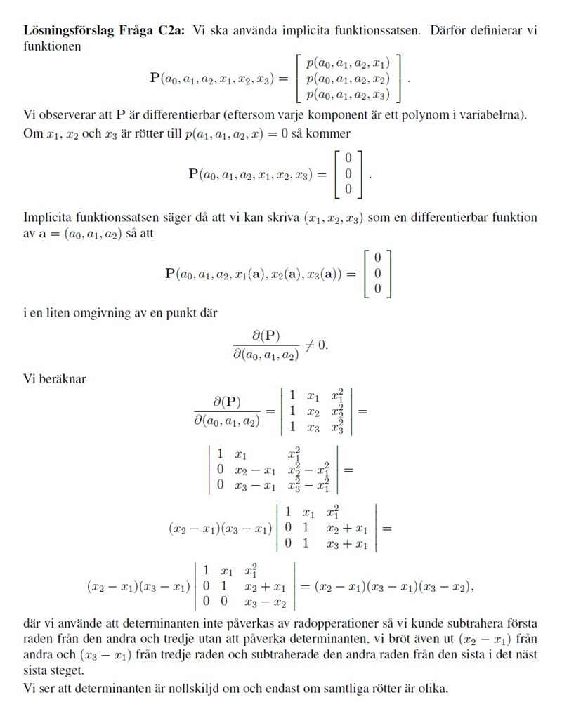 Jag har endast undring om a) delen. Specifikt förstår jag inte varför de väljer just att undersöka jakobian determinanten av P med avseende på just de "oberoende" variablerna a = (a0,a1,a2). Vad jag förstått av implicita funktionssatsen så är det "beroende" variablerna, dvs x1,x2 och x3 då dem är beroende av a=(a0,a1,a2), som man vill ta med avseende på när man undersöker om jakobian determinanten är nollskiljd i syfte att avgöra om x1,x2,x3 kan uttryckas som funktion av variablerna a = (a0,a1,a2) i omgivning av någon punkt.