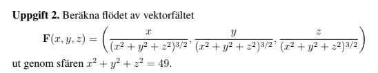 Som vissa kanske ser direkt så går det inte att använda gauss sats utan det krävs en lite annan metod där man delar upp sfären i en övre och undre halva osv. Mycket beräkningar ligger bakom men jag undrar iallafall om någon kanske kan se direkt ifall jag gjort rätt för jag misstänker att det faktum att det är ett klot på den andra uppgiften inte gör någon skillnad. Men radien är ju annorlunda, men när jag gör min beräkning så tar många av siffrorna ut sig efter att jag beräknat sista integralen och jag blir kvar med samma flöde som sfären med radie 1. Känns ologiskt, borde inte en större sfär ha ett större flöde? Jag får iallafall som totalt flöde och det får även de. Finns det någon som direkt kan säga att nej sfärens storlek påverkar inte det totala flödet eller nått i den stilen, eller har jag gjort något fel? Kan det vara så att vektorfältet i denna uppgift är speciellt för den påverkas ju av sfärens storlek då man subsituterar z osv?
