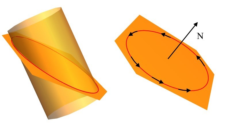 Kurvan som bildas av skärningen är någon form av diagonalcirkel dvs den ligger inte platt i z-led. (obs vet ej formella defintionen på detta). Omloppsriktningen är ju moturs men jag vet inte hur det påverkar beräkningen? Och om det påverkar hur skulle det påverka parameterframställngen respektive stokes?