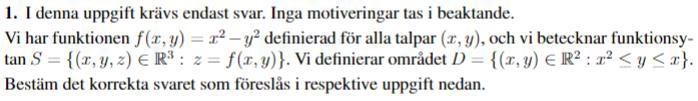 Om vi börjar med origo (det ingår ju i D). Vilket z-värde har punkten? Du vet ju att z = f(x,y) och att f(x,y) = x2-y2.