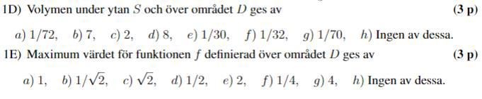 I svaret står det att jag ska komma fram till 1/70. Vad gör jag efter att jag har hittat en sadelpunkt i D och en max och min punkt på randen D. Skulle någon också kunna hjälpa mig med 1 E)