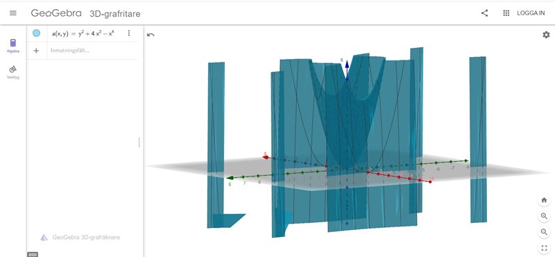 Jag ritade upp den i geogebra, se bilden nedan. Om jag inte tänker fel så borde den vara begränsad i z-led till 4, om man då utgår från svaret i b. Den är väl också begränsad i x-led mellan . Jag vet inte riktigt hur jag utifrån detta ska ställa upp en trippelintegral för att beräkna volymen.