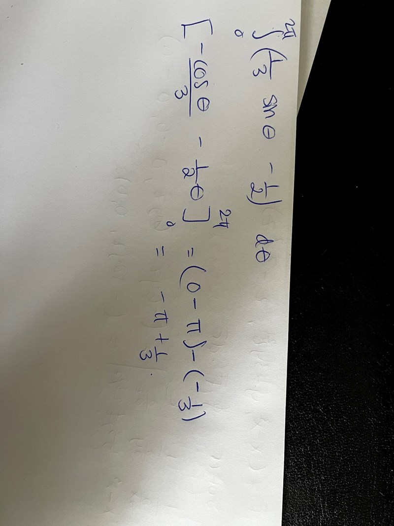 Det blir det inte. Minusettan finns ju kvar, utbruten. r*sinus blir noll, integrerad över en period i vinkelled.