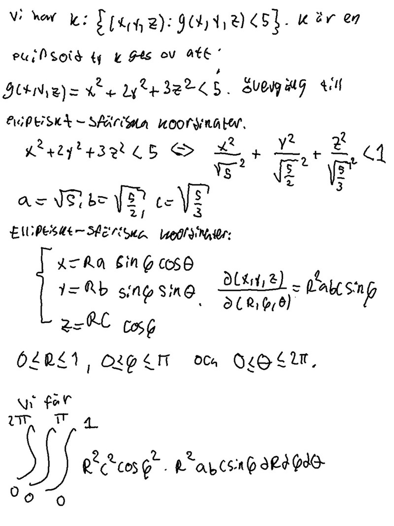 Hej! Jag försöker lösa denna uppgift (b)-uppgiften). Förstår hur facit gör och tycker att det är högst rimligt. Jag använde däremot ett annat koordinatbyte- elliptiskt-sfäriska koordinater, som om jag minns rätt uttrycks som jag gjorde nedan. Däremot får jag inte samma svar som facit, jag får en drygt 6 gånger större integral om jag sätter i värdena på ,,. Vad gör jag för fel?