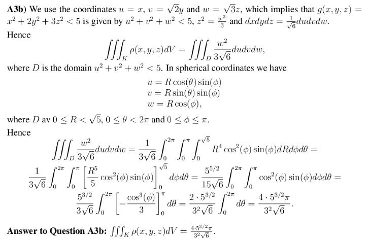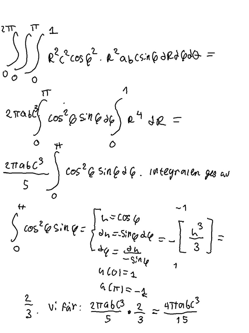 Nedan följer uppgiften samt mina lösningar. Observera att jag kanske kunde varit lite tydligare där jag skrev "integralen ges av..." på andra bilden, det är en kort tankepaus där jag beräknar trig-integralen för sig. Jag infogar det svaret tillsammans med de andra numeriska värdena från övriga integraler i trippelintegralen på slutet.