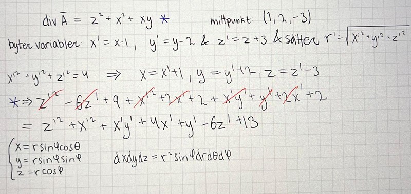 Hej! Har fastnat helt på hur man beräknar flödet av ett fält genom en sfär som förflyttats från origo. Tänkte försöka göra ett koordinatbyte och sen sfäriska koordinater men integranden blir genast väldigt komplicerad och jag vet inte hur jag ska komma vidare och skulle verkligen uppskatta hjälp!
