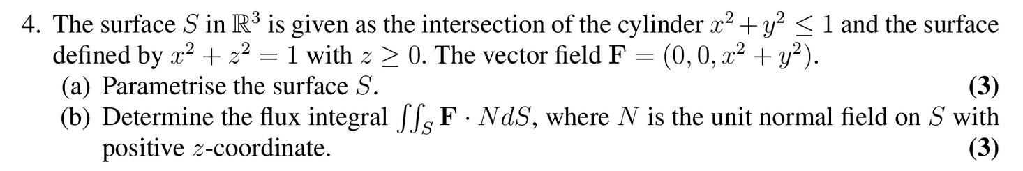 Det är deluppgift b) jag sitter och fnular på. Jag ritade upp ytan på papper och verifierade med Desmos och får det till en cylinder och en "halvcylinder" som skär varandra. När man sluter till ytan får jag det till tre ytor, inte som facit får det till två. Den ytan som jag anser saknas adderar inget till själva integralen, men jag är nyfiken på om jag misstolkat facit eller inte. Se det jag ritade upp i desmos: https://www.desmos.com/3d/bf80d190ff. Jag får det till att den blå ytan (den del som ligger inuti den röda cylidern) är $S$ i facit (detta är den integral vi söker). Jag tolkar $S_1$ som någon av de gröna eller lila locken (de ska vara halvcirklar, lyckades inte få till det i Desmos). Tolkar jag det rätt då? Isåfall, anser jag att det är här något saknas. Bör man inte inkludera båda "locken" i sin lösning?