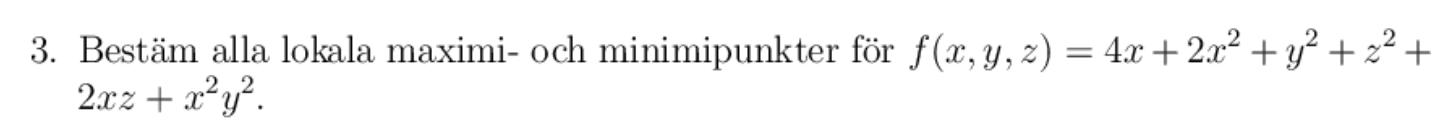 Du har räknat ut 3 av andraderivatorna. De övriga är f"xx =4+2y2, f"yy = 2+2x2 och f"zz = 2 (kontrollera!)