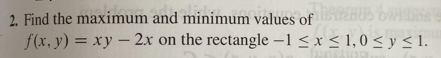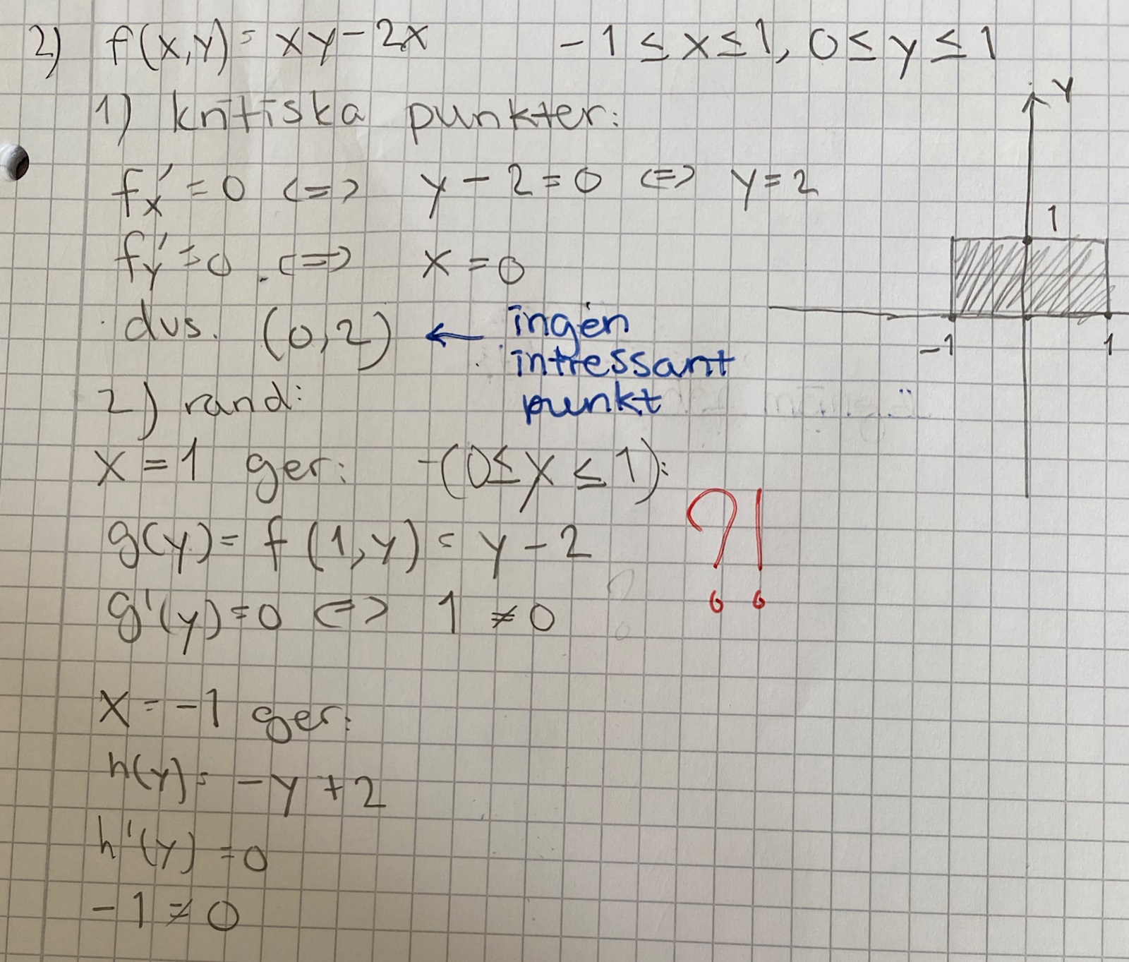 Jag har fått lära mig att man först ska undersöka kritiska punkter men den punkten ingick inte i det område vi sökte i. Sedan att man ska undersöka randen, och då gjorde jag så att jag satte x = 1 och fick en ny funktion som jag skulle kolla när g'(y)=0 men då fick jag att -1=0 (!?), samma sak sedan för x=-1, så jag förstår inte riktigt hur man ska tänka eller göra där.