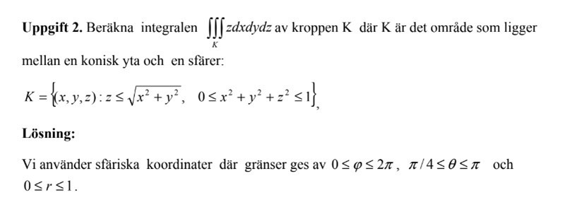 K ligger inuti enhetssfären. K är dessutom begränsad uppåt av ytan z=sqrt(x^2+y^2)