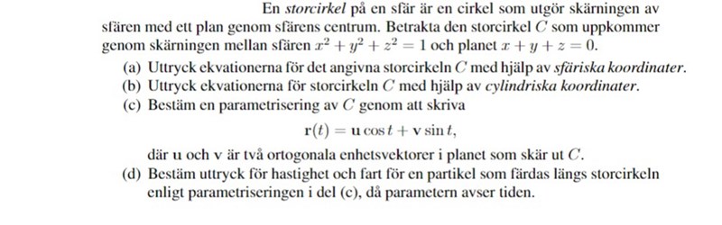 På (a): Du ska ange ekvationen för storcirkeln, inte bara vilka intervall som de individuella koordinaterna ligger i. Vet faktiskt inte riktigt hur jag ska tolka det du skrivit. Det är ju sant att R ligger mellan -1 och 1, men på storcirkeln är R = 1, eftersom sfären har radie 1.