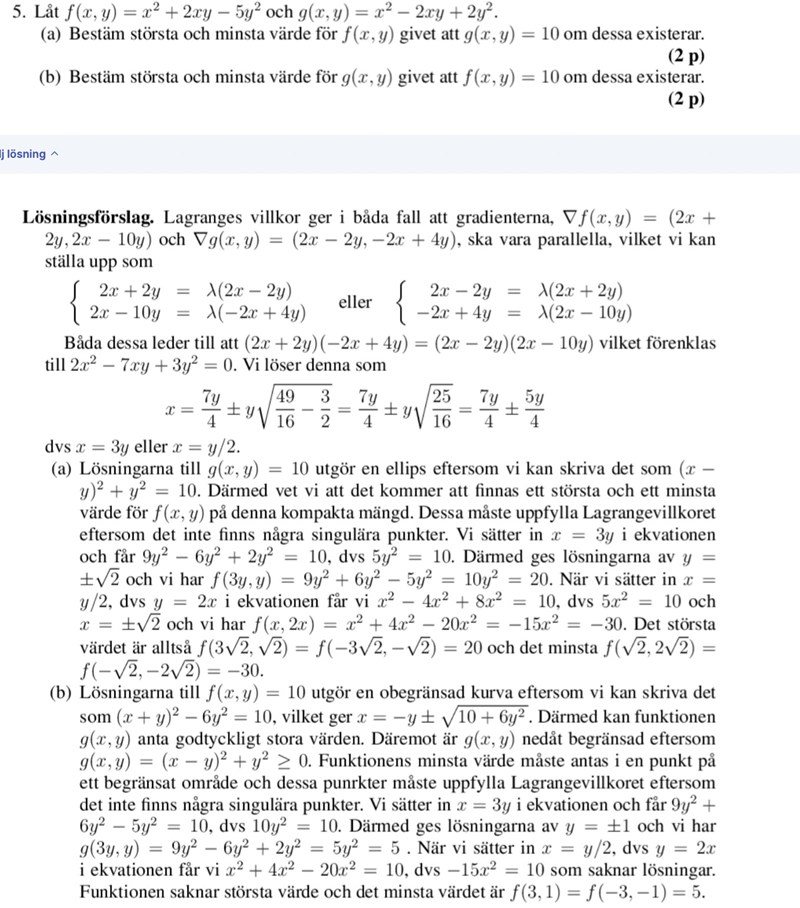 Dessutom fattar jag inte varför i a) ellips innebär att det har ett största och minsta värde? Är det bara att den är kompakt? Och varför skrev de om den till (x-y)^2+y^2 = 10, ska man alltid göra det?