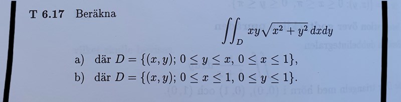 Integrationsområdet i a) är ju bara triangeln under y=x, men i b) en kvadrat som att man liksom flippar över. Då så säger jag att avbildningen (x,y)-->(-x,-y) är spegling i y=x och att f(x,y)=f(-x,-y) och integrationsområdet är symmetriskt kring y=x så det är integralen i a) gånger två?