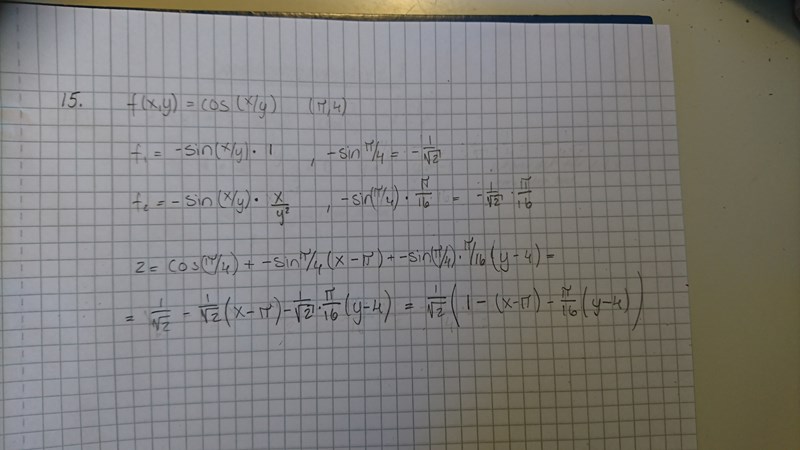 Jag har nästan löst den men jag förstår inte varför det i facit står i den stora parantesen : 1- ((x-pi) /4)+...)